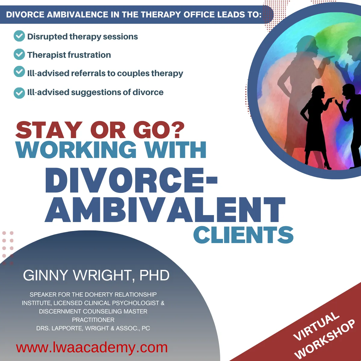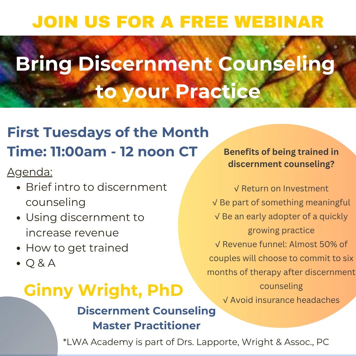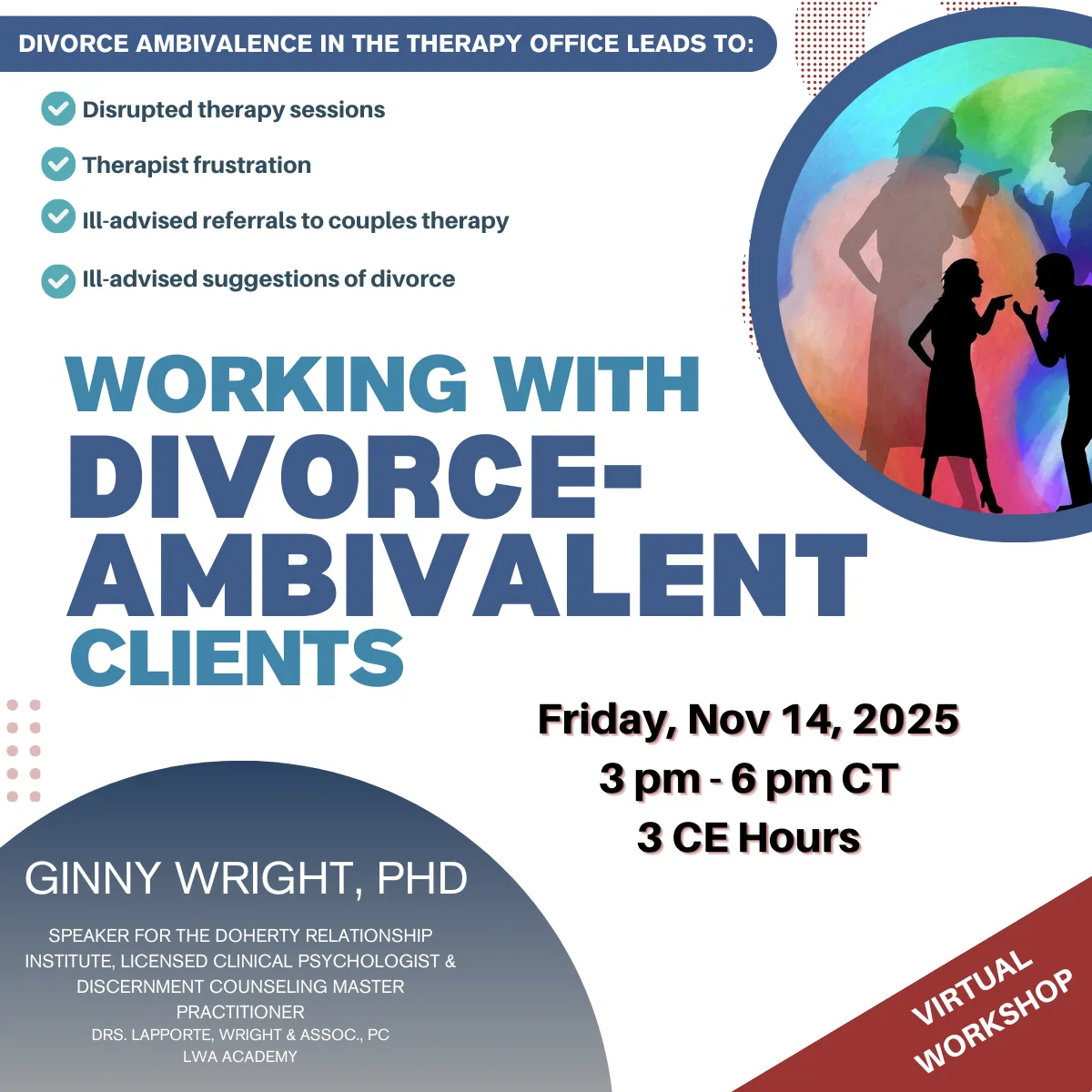 LWA Academy (Drs. Lapporte, Wright & Assoc., PC) is approved by the IDFPR to provide continuing education courses to mental health professionals in Illinois. (IL Lic #268-000161 for PhD, PsyD, LPC, LPCP, LSW, LCSWIL and Lic. #168-000277 for LMFT Individual courses are approved for CE credit through NBCC and/or EAC. Participant is responsible for checking eligibility for CE credit according to licensure, location and specific course attended.
